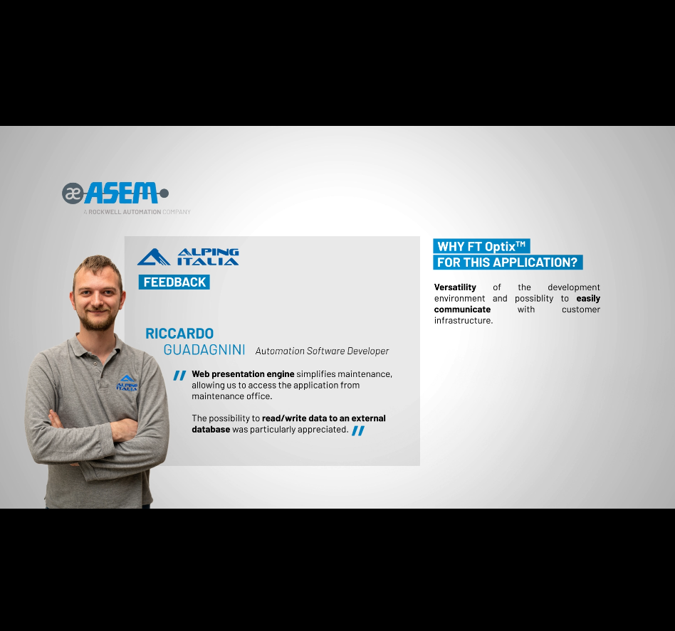 Perché FactoryTalk® Optix™ per questa applicazione? Versatilità dell’ambiente di sviluppo e possibilità di comunicare facilmente con l’infrastruttura del cliente.